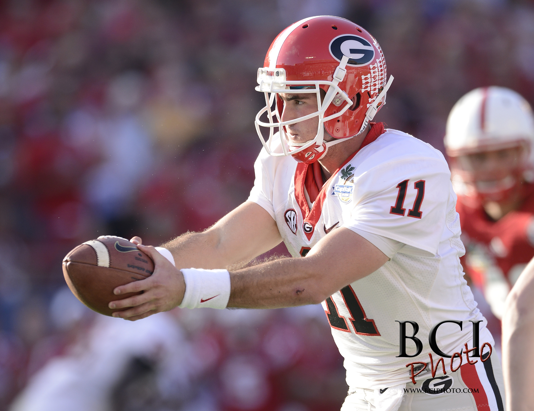 January 01, 2013; Orlando, FL, USA; Georgia Bulldogs quarterback Aaron Murray (11) hands the ball off during the second half of the Capital One bowl against the Nebraska Cornhuskers at The Citrus Bowl.Murray was named MVP as Georgia defeated Nebraska 45-31. Mandatory Credit: Brad Barr-USA TODAY Sports