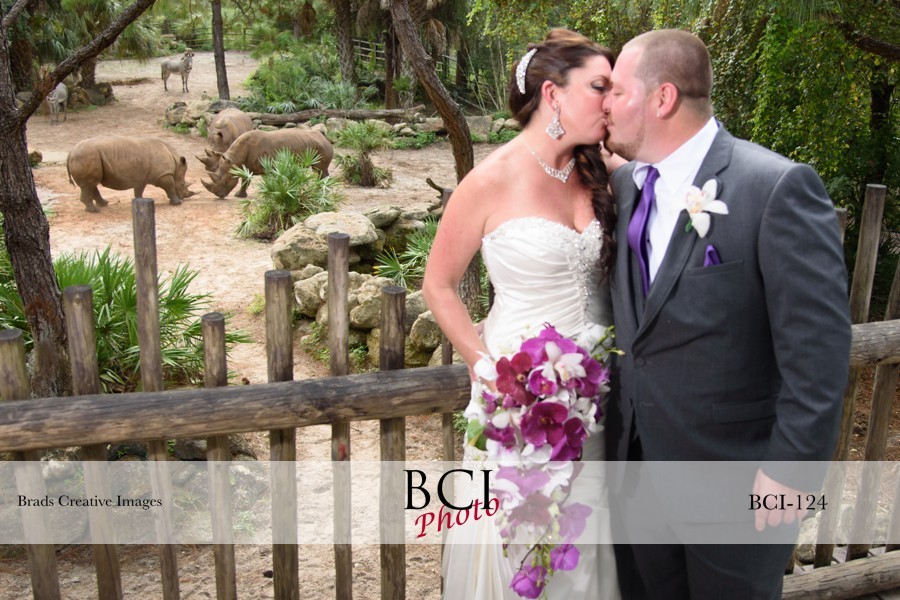 We love getting the opportunity to shoot a wedding at someplace new! (doesn’t happen that much any more of course). Even more so, on a Friday. So yesterday’s wedding at the Brevard Zoo was an awesome event all the way around. Of course, it is a public zoo, so there are lots of regulations about when and where you can go on the grounds, but ultimately, we had a great time with all the animals at the zoo! Megan from the Zoo made sure we could get to all the animals and then even tended bar! We kinda had a Treasure Coast invasion too, as most of the guests, as well as the vendors were from this area. Which was nice too, since we didnt have to worry about anything going awry, and ended up with a fantastic event for our couple! Weddings by Rachel handled all the decor, planning and officiating. Cakes by Michele delivered a zoom themed cake too, Sarandipity Florals took care of all things floral, Green Turtle Catering really had some cool and tasty eats, Candid Cabana brought a unique Photo Booth, and Dj Louie G Entertainment emceed the event with their usual style, and even added in dry ice, and a live drummer for the party too.